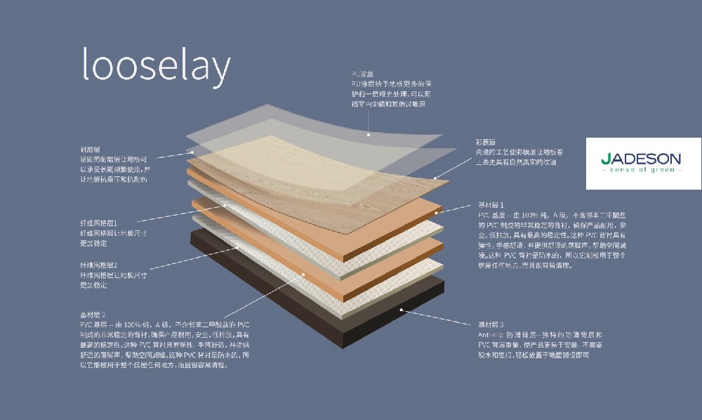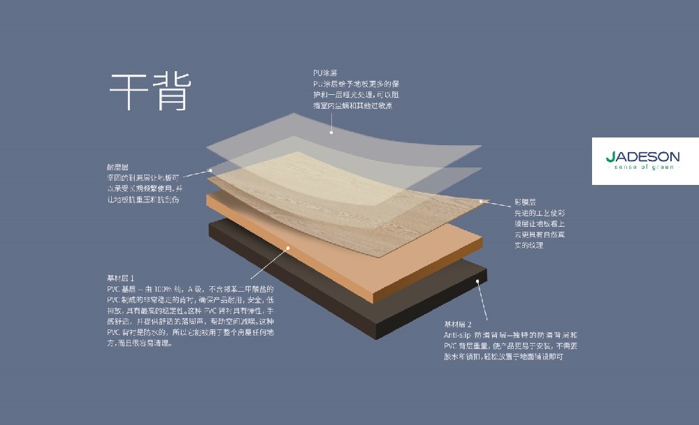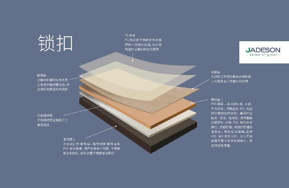 Jadeson的LVT地板由几层组成。Jadeson为每一层做出明智的原材料选择,以提供高质量的产品。每个细节都经过仔细考虑,并影响地板的质量和外观。